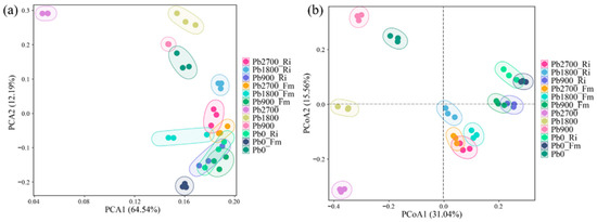Furthermore, to evaluate the β-diversity of rhizosphere bacterial communities, PCA and PCoA were performed at the ASV level (Figure 3). The results of the PCA revealed that biological replicates within each treatment group displayed significant spatial clustering in the ordination plot. This observation indicates high intra-group reproducibility and robust experimental consistency. Notably, data points from the Pb2700 treatment were distinctly separated from those of the other treatments (Figure 3a). Additionally, the PCoA results demonstrated a significant separation along the first principal component between inoculated and non-inoculated rhizosphere soil (Figure 3b). The Adonis test further demonstrated that the bacterial communities differed significantly among the 12 treatments, with an R2 value of 0.89 and a p-value of 0.001. The results indicated that the addition of Pb and AMF significantly altered the composition and structure of the soil bacterial community. This distinction was particularly pronounced in the treatments that were amended with high levels of Pb and those that included AMF alone.
