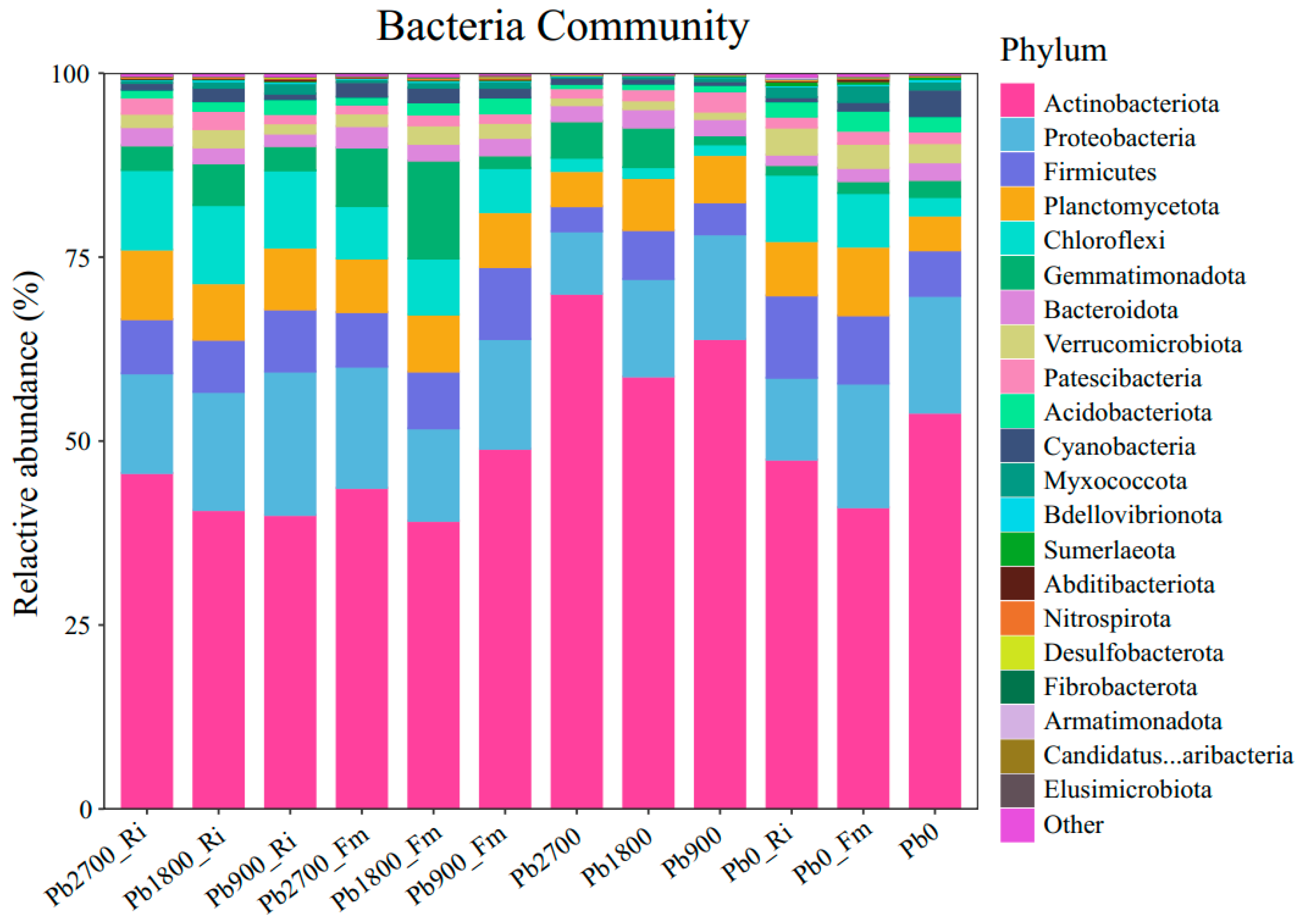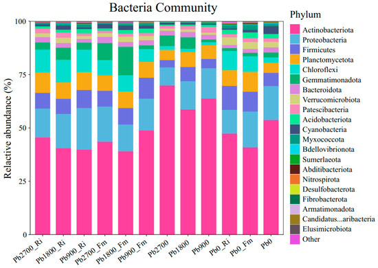 In this study, we identified a total of 48 bacterial phylum, among which 21 (43.75%) were common across all treatments, as illustrated in Figure S2 and Table S3. The number of specific phylum varied by treatment, with 34 identified for Pb2700_Ri, 33 for Pb1800_Ri, 31 for Pb900_Ri, 35 for Pb2700_Fm, 33 for Pb1800_Fm, 31 for Pb900_Fm, 32 for Pb2700, 28 for Pb1800, 25 for Pb900, 28for Pb0_Ri, 29 for Pb0_Fm, and 31 for Pb0. Additionally, a total of 21 bacterial phylum were identified across the various treatments, each exhibiting a relative abundance greater than 1%. These phyla include Actinobacteria, Proteobacteria, Firmicutes, Planctomycetota, Chloroflexi, Gemmatimonadota, Bacteroidota, Verrucomicrobiota, Patescibacteria, Acidobacteriota, Cyanobacteria, Myxococcota, Bdellovibrionota, Sumerlaeota, Abditibacteriota, Nitrospirota, and Desulfobacterota, as illustrated in Figure 4. Phylum with a relative abundance of less than 1% were categorized as ‘Others’. Notably, Actinobacteria, Proteobacteria, Firmicutes, Planctomycetota, and Chloroflexi emerged as the dominant bacterial phyla across all treatments. The addition of Pb, along with inoculation and their interaction, significantly influenced the relative abundances of Actinobacteria, Chloroflexi, and Gemmatimonadota, as detailed in Figure 4. Specifically, the introduction of Pb resulted in a marked decrease in the relative abundance of Actinobacteria across all inoculation treatments (Fm and Ri) while concurrently increasing the relative abundances of Planctomycetota and Chloroflexi in two inoculation treatments (Fm and Ri).