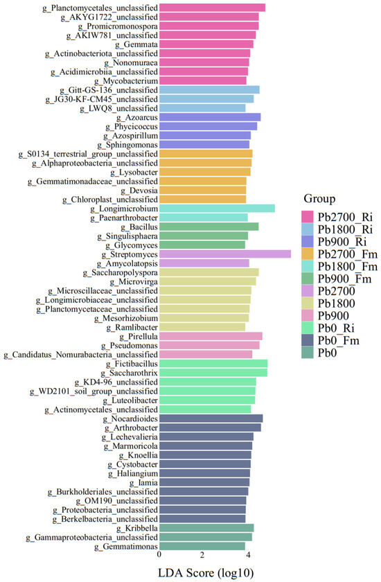 Additionally, the LEfSe method was employed to evaluate the differences in taxa between the rhizosphere microbiota of non-inoculated control and the inoculated treatments (Fm or Ri) across each Pb treatment. The top 60 genera, ranked by scores for all treatment groups, are presented in Figure 5. A greater number of species exhibited significant enrichment (LDA > 3.0) in the Pb2700_Ri and Fm treatments compared to the other treatments. In contrast, the Pb1800_Fm and Pb2700 treatments showed the lowest number of significantly enriched species. The following genera were enriched in various treatments: Kribbella, Gammaproteobacteria_unclassified, and Gemmatimonas were enriched in Pb0. In Pb0_Fm, the enriched genera included Nocardioides, Arthrobacter, Lechevalieria, Marmoricola, Knoellia, Cystobacter, Haliangium, Iamia, Burkholderiales_unclassified, OM190_unclassified, Proteobacteria_unclassified, and Berkelbacteria_unclassified. In Pb0_Ri, significant enrichment was observed for Fictibacillus, Saccharothrix, KD4-96_unclassified, WD2101_soil_group_unclassified, Luteolibacter, and Actinomycetales_unclassified. The genera Pirellula, Pseudomonas, and Candidatus_Nomurabacteria_unclassified were enriched in Pb900. In Pb1800, the enriched genera comprised Saccharopolyspora, Microvirga, Microscillaceae_unclassified, Longimicrobiaceae_unclassified, Planctomycetaceae_unclassified, Mesorhizobium, and Ramlibacter. The genera Streptomyces and Amycolatopsis were enriched in Pb2700. In the Pb900_Fm treatment, enrichment was noted for Bacillus, Singulisphaera, and Glycomyces. For Pb1800_Fm, Longimicrobium and Paenarthrobacter were enriched. In Pb2700_Fm, the enriched genera included S0134_terrestrial_group_unclassified, Alphaproteobacteria_unclassified, Lysobacter, Gemmatimonadaceae_unclassified, Devosia, and Chloroplast_unclassified. The genera Azoarcus, Phycicoccus, Azospirillum, and Sphingomonas were enriched in Pb900_Ri. In Pb1800_Ri, enrichment was observed for Gitt-GS-136_unclassified, JG30-KF-CM45_unclassified, and LWQ8_unclassified. Finally, in Pb2700_Ri, the enriched genera included Planctomycetales_unclassified, AKYG1722_unclassified, Promicromonospora, AKIW781_unclassified, Gemmata, Actinobacteriota_unclassified, Nonomuraea, Acidimicrobiia_unclassified, and Mycobacterium.