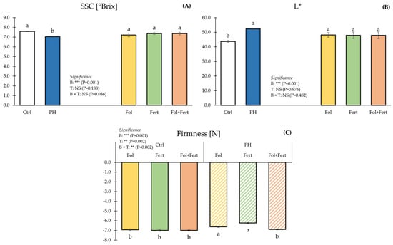 Impact of biostimulant (B) and application mode (T) on soluble solids content (A), brightness (B) and firmness (C) of strawberry fruits. Data with the same letter are statistically similar agreeing to Tukey test. Results are presented as mean ± SE. Ctrl: untreated; PH: treated with 1.5 mL/L of corn-derived protein hydrolysate; Fol: foliar; Fert: fertigation.