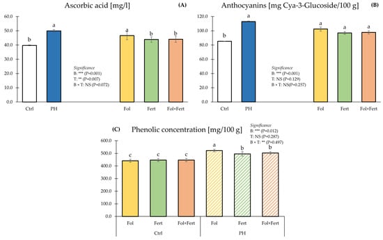 Impact of biostimulant (B) and application mode (T) on ascorbic acid (A), anthocyanins (B) and phenolic concentration (C) of strawberry fruits. Data with the same letter are statistically similar agreeing to Tukey test. Results are presented as mean ± SE. Ctrl: untreated; PH: treated with 1.5 mL/L of corn-derived protein hydrolysate; Fol: foliar; Fert: fertigation.