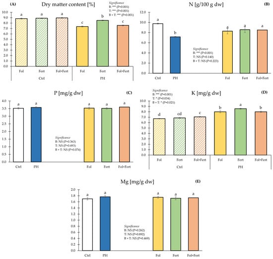 Impact of biostimulant (B) and application mode (T) on dry matter content (A), nitrogen (B), phosphorous (C), potassium (D) and magnesium (E) of strawberry fruits. Data with the same letter are statistically similar agreeing to Tukey test. Results are presented as mean ± SE. Ctrl: untreated; PH: treated with 1.5 mL/L of corn-derived protein hydrolysate; Fol: foliar; Fert: fertigation.