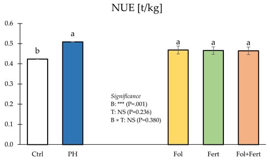 Statistical analysis for NUE did not show a significant effect of the B×T interaction (Figure 4).