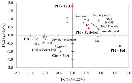The first component was largely positively associated to yield, NMFP, L*, ascorbic acid, total phenols, anthocyanins, Mg and NUE, and negatively interrelated to SSC, dry matter, and N; PC2 was primarily positively connected to yield, NMFP, L*, firmness, P, K and NUE, and negatively linked to MWMF (Table 2). The PH × Fol is situated in the bottom-right side of the loading plot, the Ctrl × Fol, Ctrl × Fert+Fol, Ctrl × Fert treatments are located in the bottom-left side, PH × Fert+Fol is positioned in the upper-right side, while PH × Fert treatment is sited in the upper-left side (Figure 5).