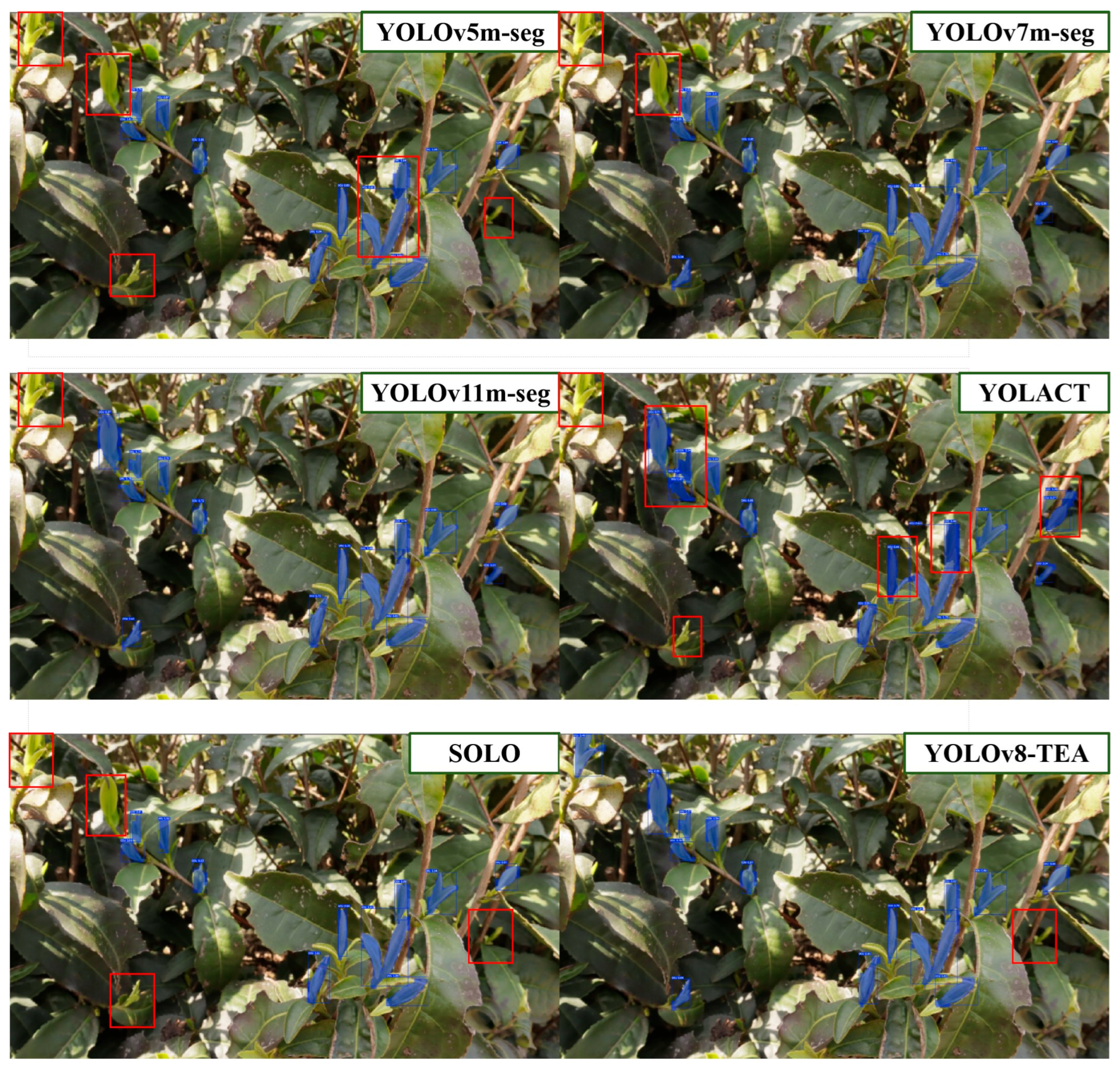 Figure 15 shows the segmentation test results of each method on the same test image, where the poor segmentation results are circled in red boxes. All of these models have missed detection, and SOLO has a more serious level of missed detection. At the same time, YOLOv5m-seg and YOLOv7m-seg still have an incomplete segmentation of the boundary of tea shoots, YOLACT struggles to identify the segmentation boundary between some background regions and tea shoots, and YOLOv11m-seg has low segmentation accuracy for small-size shoots. In summary, it can be seen that YOLOv8-TEA not only leads in overall segmentation accuracy, but also is more accurate in edge detail processing.