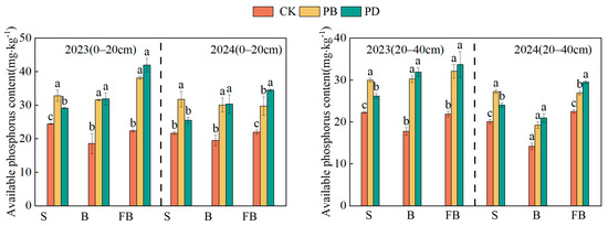 Phosphorus fertilizer application methods influenced soil available phosphorus content across soil layers and growth stages from 2023 to 2024. (CK: Control treatment, PB: Phosphorus fertilizer basal application treatment, PD: Phosphorus fertilizer drip application treatment, S: Seedling stage, B: Bud stage, FB: Flowering and boll stage). Different lowercase letters denote significant differences (p < 0.05) among treatments.