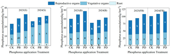 Effects of phosphorus application methods on phosphorus accumulation in different plant organs across growth periods from 2023 to 2024. (CK: Control treatment, PB: Phosphorus fertilizer basal application treatment, PD: Phosphorus fertilizer drip application treatment, S: Seedling stage, B: Bud stage, FB: Flowering and boll stage). Different lowercase letters denote significant differences (p < 0.05) among treatments.