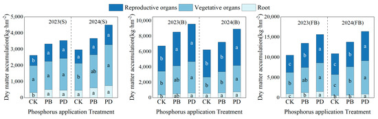Effects of phosphorus application methods on dry matter mass of plant organs across growth stages from 2023 to 2024. (CK: Control treatment, PB: Phosphorus fertilizer basal application treatment, PD: Phosphorus fertilizer drip application treatment, S: Seedling stage, B: Bud stage, FB: Flowering and boll stage). Different lowercase letters denote significant differences (p < 0.05) among treatments.