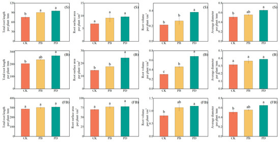 Effects of phosphorus application methods on cotton root parameters across growth stages in 2024. (CK: Control treatment, PB: Phosphorus fertilizer basal application treatment, PD: Phosphorus fertilizer drip application treatment, S: Seedling stage, B: Bud stage. FB: Flowering and boll stage). Different lowercase letters denote significant differences (p < 0.05) among treatments.