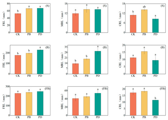 Effects of phosphorus application methods on cotton root length across growth stages in 2024. (FRL: Fine root length, MRL: Medium root length, CRL: Coarse root length, CK: Control treatment, PB: Phosphorus fertilizer basal application treatment, PD: Phosphorus fertilizer drip application treatment, S: Seedling stage, B: Bud stage, FB: Flowering and boll stage). Different lowercase letters denote significant differences (p < 0.05) among treatments.