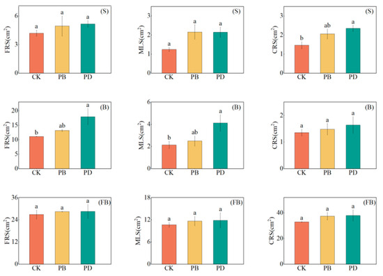 Effects of phosphorus application methods on cotton root surface area across growth stages in 2024. (FRS: Fine root surface area, MRS: Medium root surface area, CRS: Coarse root surface area, CK: Control treatment, PB: Phosphorus fertilizer basal application treatment, PD: Phosphorus fertilizer drip application treatment, S: Seedling stage, B: Bud stage, FB: Flowering and boll stage). Different lowercase letters denote significant differences (p < 0.05) among treatments.