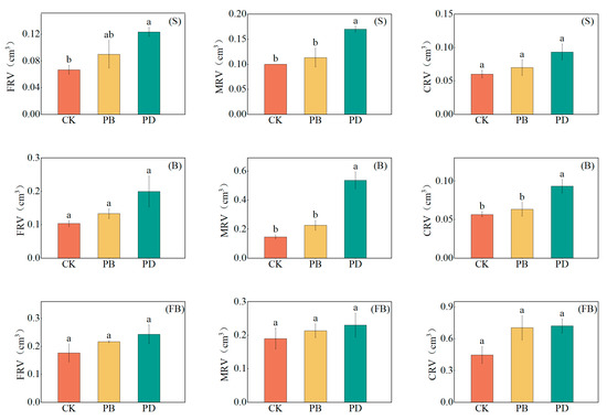 Effects of phosphorus application methods on cotton root volume across growth stages in 2024. (FRV: Fine root volume, MRV: Medium root volume, CRV: Coarse root volume, CK: Control treatment, PB: Phosphorus fertilizer basal application treatment, PD: Phosphorus fertilizer drip application treatment, S: Seedling stage, B: Bud stage, FB: Flowering and boll stage). Different lowercase letters denote significant differences (p < 0.05) among treatments.