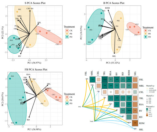 Principal Component 1 (PC1) and Principal Component 2 (PC2) explained 56.97% and 22.1% of the total data variation, respectively, collectively accounting for 79.07% of the variation. This effectively captured the differences in key characteristic variables across treatments (Figure 8). The primary contributing variables of PC1 included coarse root length (CRL), total root length (TRL), root surface area (RSA), and specific root length (SRL), indicating significant differences in these variables among treatments, particularly with greater contributions to the PB group. The main contributing variables of PC2 were P absorption efficiency (PAE), fine root length (FRL), and yield, suggesting these variables dominated in the PD group.