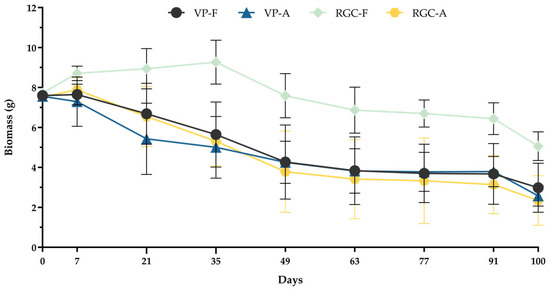This study revealed a non-significant effect from the substrate, species, and time on the earthworm fresh biomass (Figure 1). Except for RGC-F, all treatments presented a similar time-dependent decrease in earthworm biomass. In RGC-F, an initial and steady increase was observed until day 35, and thereafter, the earthworm fresh biomass showed similar behavior to the other treatments. For all of the treatments, the earthworms’ biomass decreased along the vermicomposting process, reaching the lowest values at the 100th day (VP-F: 2.99 ± 1.23 g; VP-A: 2.58 ± 0.52 g; RGC-F: 5.07 ± 0.72 g; RGC-A: 2.34 ± 1.25 g).