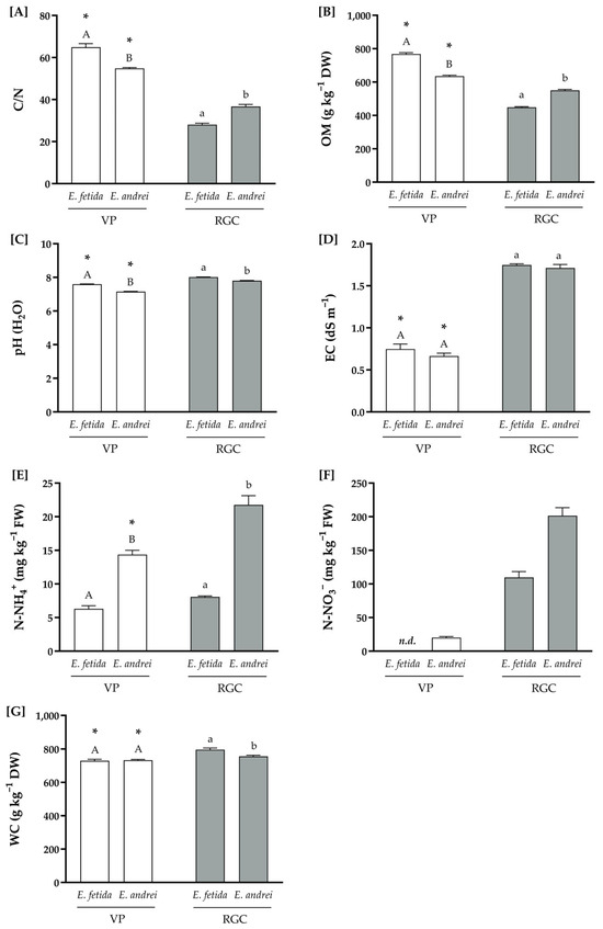 Main physical properties of vermicomposts: (A) C/N ratio, (B) organic matter (OM), (C) pH (H2O), (D) electrical conductivity (EC), (E) ammoniacal nitrogen (N-NH4+), (F) nitrate nitrogen (N-NO3−), and (G) water content (WC). Data are presented as mean ± SD (n = 3). Statistical analysis was performed using two-way ANOVA. Different uppercase and lowercase letters represent significant differences between species within vine prunings (VPs) and rotten grape clusters (RGCs), respectively, while * represents significant differences between the substrates within the same species (p < 0.05). DW = dry weight; n.d. = not detectable.