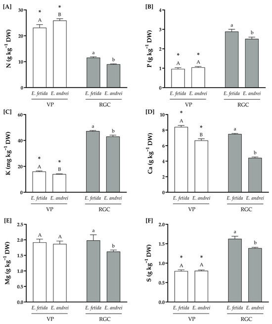 Contents of macronutrients present in the vermicomposts: (A) N, (B) P, (C) K, (D) Ca, (E) Mg, and (F) S. Data are presented as mean ± SD (n = 3). Statistical analysis was performed using two-way ANOVA. Different uppercase and lowercase letters represent significant differences between species within vine prunings (VPs) and rotten grape clusters (RGCs), respectively, while * represents significant differences between the substrates within the same species (p < 0.05). DW = dry weight.