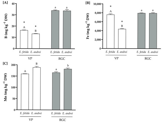 Contents of micronutrients present in the vermicomposts: (A) B, (B) Fe, and (C) Mn. Data are presented as mean ± SD (n = 3). Statistical analysis was performed using two-way ANOVA. Different uppercase and lowercase letters represent significant differences between species within vine prunings (VPs) and rotten grape clusters (RGCs), respectively, while * represents significant differences between the substrates within the same species (p < 0.05). DW = dry weight.