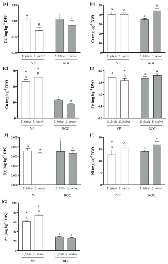 Metal contents of the vermicomposts: (A) Cd, (B) Cr, (C) Cu, (D) Pb, (E) Hg, (F) Ni, and (G) Zn. Data are presented as mean ± SD (n = 3). Statistical analysis was performed using two-way ANOVA. Different uppercase and lowercase letters represent significant differences between species within vine prunings (VPs) and rotten grape clusters (RGCs), respectively, while * represents significant differences between the substrates within the same species (p < 0.05). DW = dry weight.