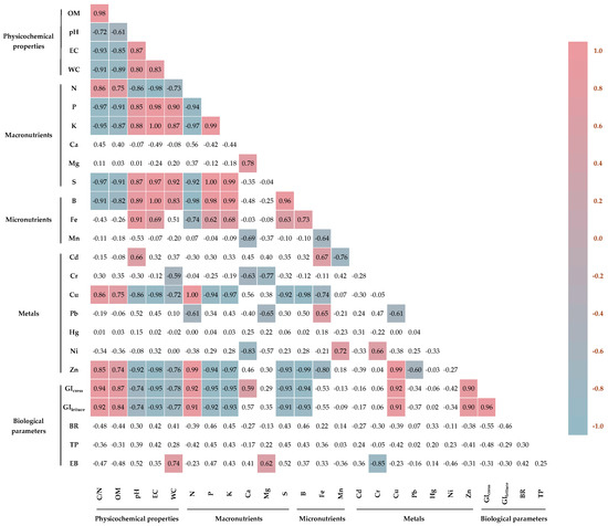 Spearman correlation between physicochemical properties, macronutrients, micronutrients, metals, biological parameters, and set-up variables. Cells shown in white have insignificant correlations (p > 0.05). OM = organic matter; EC = electrical conductivity; WC = water content; N = nitrogen; P = phosphorus; K = potassium; Ca = calcium; Mg = magnesium; S = sulfur; B = boron; Fe = iron; Mn = manganese; Cd = cadmium; Cr = chromium; Cu = copper; Pb = lead; Hg = mercury; Ni = nickel; Zn = zinc; GI = germination index; BR = basal respiration; TP = total polyphenols; EB = earthworm biomass.