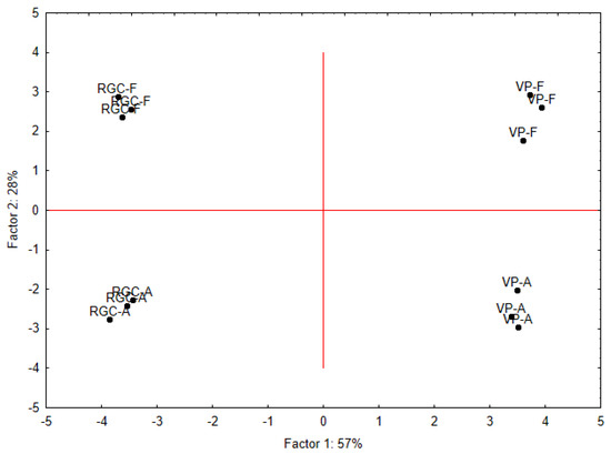 Principal component analysis (PCA), based on the physicochemical properties, macro- and micronutrient contents, metal concentrations, and biological parameters, revealed that the first two factors explained 85% of the total variance (Figure 7). Factor 1, which was the most significant one, accounted for 58% of the variance and differentiated the residues (RGCs and VPs) used in the vermicomposting process. The clear separation between these groups highlights significant structural and functional differences between the two types of residues. Factor 2 explained an additional 27% of the variance and separation of the earthworm species: E. fetida (F) and E. andrei (A). Despite this differentiation, a high degree of similarity was observed between the samples treated with E. fetida and E. andrei within each residue type, suggesting that the earthworm species had a lesser influence compared with the nature of the organic material itself. These findings highlight the key role of the initial composition of the organic substrate in determining the final characteristics of the vermicompost. Conversely, the impact of the earthworm species appeared to be more limited within the range of variables analyzed, emphasizing the importance of selecting appropriate raw materials for vermicomposting.