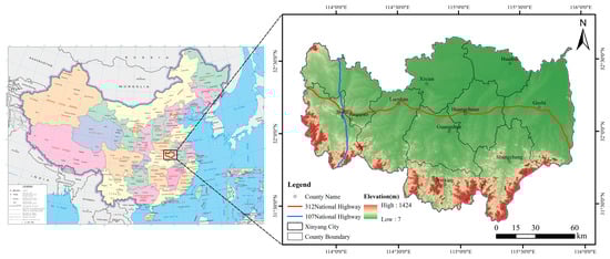 The study area is located in southern Henan, China (Figure 1). National Highway G107 runs from the Hong Kong Special Administrative Region in the south to Beijing in the north, spanning a total length of 2698 km. It traverses the North China, Central China, and South China regions, serving as a crucial north/south arterial route. The average daily traffic volume on this road is 20,000 vehicles, with large vehicles (trucks, large and medium-sized buses) accounting for about 53%. National Highway G312 stretches from Huangpu District, Shanghai, in the east to Horgos city in the Ili Kazakh Autonomous Prefecture, Xinjiang, in the west, spanning a total length of 4967 km. It passes through nine provincial-level regions: Shanghai, Jiangsu, Anhui, Henan, Hubei, Shaanxi, Ningxia, Gansu, and Xinjiang. The average daily traffic volume on this road is 17,000 vehicles, with the proportion of heavy vehicles being as high as 41%. National Highways G107 and G312 are major transportation arteries in Xinyang City, Henan Province, China. This region is classified as a transitional zone between subtropical and warm temperate climates, characterized by a distinct monsoon climate. It enjoys ample sunshine with an annual duration of 1900–2100 h. The mean annual temperature ranges from 15.3 to 15.8 °C, accompanied by a prolonged frost-free period averaging 220–230 days. The area experiences abundant rainfall, with annual precipitation of 993–1294 mm, high humidity, and a mean annual relative humidity of 74–78%.