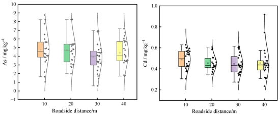 The ANOVA results indicated that for National Highway G312, no significant differences were observed in Zn concentrations between 10 and 30 m, nor among 20 m, 30 m, and 40 m distances. All other elements showed no significant variations within 0–40 m of the roadside. For National Highway G107, As, Cu, and Zn exhibited no significant differences across 0–40 m roadside distances, while certain variations were detected in other elements at different roadside distances.