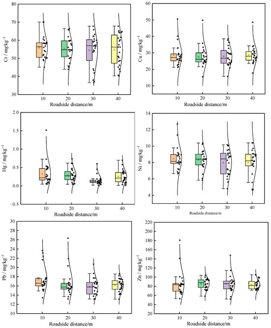 The statistical characteristics of soil heavy metals in roadside soil are shown in Table 4. The concentration hierarchy was Zn > Cr > Cu > Pb > Ni > As > Cd > Hg, with coefficients of variation (CV) ranking as Hg > As > Cd > Cu > Zn > Ni > Cr > Pb. Among them, the coefficient of variation for Hg ranged from 63.01% to 95.19%, which is highly variable. The coefficients of variation of soil As roadside distances of 10–30 m are classified as medium-height variability, and roadside distances of 40m are classified as medium variability. The coefficients of variation of soil Cd, Cu, Cr, Ni, Pb, and Zn are classified as medium variability. Comparative analysis with Henan Province soil background values revealed exceedances for Cd, Cu, Hg, and Zn, while As, Cr, Ni, and Pb remained within baseline levels. The mean value of As, Cr, Hg, Ni, and Pb at roadside distances are 10 m > 20 m > 40 m > 30 m. The mean values of Cu and Zn at roadside distances are 10 m > 20 m > 30m > 40 m; the mean value of Cd at roadside distances is 10 m > 20 m = 30 m = 40 m (Figure 2).