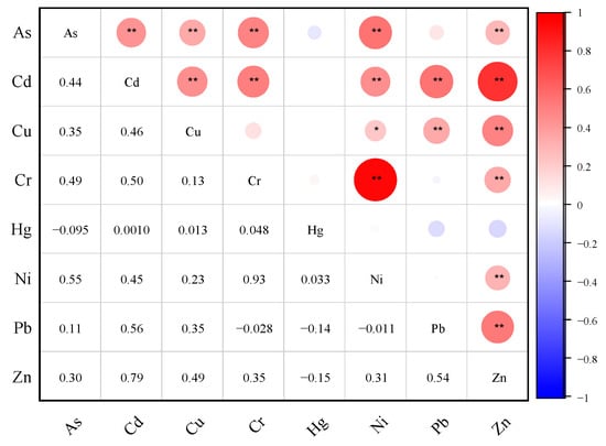 Correlation analysis of heavy metal elements in soil (* and ** mean significant difference at the 5% and 1% levels, respectively).