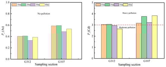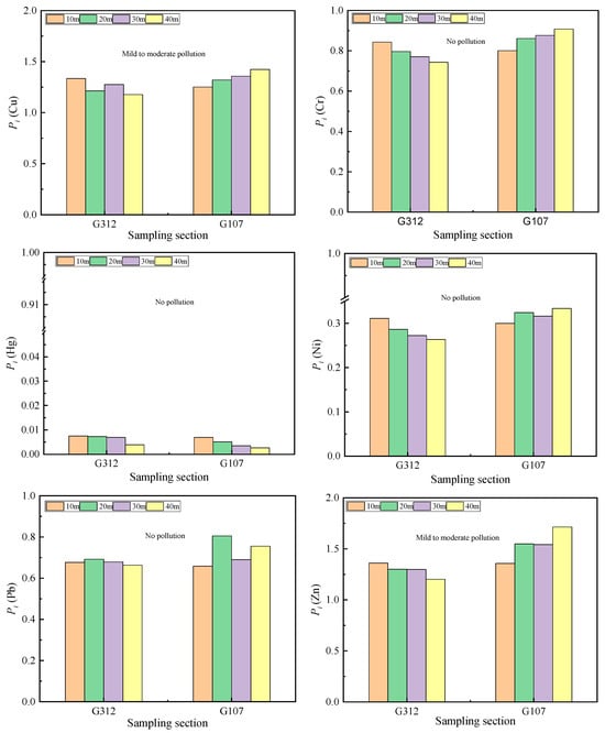 Figure 4 presents the single factor evaluation results of soil heavy metals. For Cd along the National Highway G312, the pollution index values at 10 and 20 m roadside distances ranged between 3 and 5 (indicating heavy pollution), while those at 40 and 50 m distances showed Pi values of 2–3 (classified as a moderate level of pollution). The Pi of soil Cd at 10 m, 20 m, 30 m, and 40m on roadside from National Highway G107 indicated heavy pollution levels, whereas soil Cu and Zn were considered at the mild to moderate pollution level at 10–40 m from the National Highways G107 and G312. A no-pollution level was determined for the other heavy metals (As, Cr, Hg, Ni, and Pb) at 10–40 m from the National Highways G107 and G312.