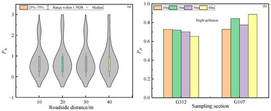 The Nemerow pollution index results are presented in Figure 4. The box-overlaid violin plot (Figure 5a) reveals that roadside distances followed the PN magnitude sequence: 20 m (0.78) > 40 m (0.77) > 30 m (0.74) > 10 m (0.73), though the overall differences were not substantial. The mean PN values of soil heavy metals across different road sections exhibited the following order: National Highway G107 (0.81) > National Highway G312 (0.70). Figure 5b demonstrates that within the roadside distance range of 10–40 m along the National Highways G312 and G107, the mean PN values of soil heavy metals ranged from 0.7 to 1.0, collectively corresponding to an overall moderately clean level.