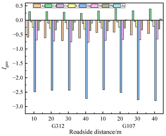 The results of the geoaccumulation index show that (Figure 6) along the National Highway G312, soil heavy metals exhibited the order Cd (0.281) > Zn (−0.070) > Cu (−0.090) > Cr (−0.285) > Pb (−0.347) > As (−0.633) > Ni (−0.733) > Hg (−2.521), while along the National Highway G107, the sequence was Cd (0.360) > Zn (0.003) > Cu (−0.054) > Cr (0.243) > Pb (−0.320) > As (−0.456) > Ni (−0.675) > Hg (−2.622). Comparative analysis demonstrated that the geoaccumulation indices were generally higher for the National Highway G107 than those for the National Highway G312. The geoaccumulation index of soil Cd at 10–40 m from the National Highway G312 and National Highway G107 roadsides was between 0 and 0.5, which is at the mild to moderate pollution level, and the accumulation index of soil Zn for National Highway G107 within 20–40m of roadsides was between 0.002 and 0.042, which is slightly polluted. The values of the accumulation indexes for soil Cu, Cr, Pb, As, Ni, and Hg at 10–40 m from National Highway G312 and G107 were all less than 0, which was classified as unpolluted.
