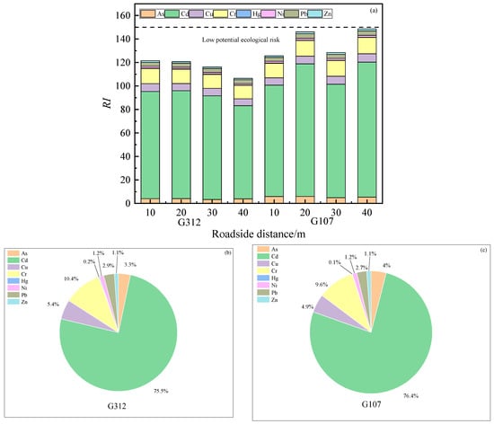 Potential ecological risk of heavy metals in roadside soil (a) and contribution rate of ecological risk of each heavy metal element on National Highways G312 (b) and National Highways G107 (c).