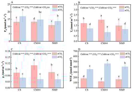 Leaf gas exchange and water use efficiency of three wheat cultivars under different CO2 growth environments. Note: net photosynthetic rate (Pn) (A), transpiration rate (Tr) (B), stomatal conductance (Gs) (C), intrinsic water use efficiency (WUEi) (D). Different letters on the columns indicate statistically significant difference between the treatments according to Tukey’s test at p < 0.05. Error bars indicate standard error of the means (SE). The effects of CO2 concentration, cultivar and their interactions are presented. * and ***, respectively, represent the significant levels when p < 0.05 and p < 0.001; “ns” represents non-significant difference. Abbreviations: CS, Chinese spring; CM44, Chuanmai 44; NM9, Neimai 9.