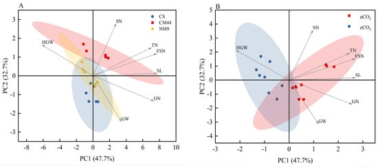 Principal component analysis (PCA) analysis of yield-related traits (A) in three wheat cultivars and (B) under different CO2 conditions. The contributions of each PCA axis (PC1 and PC2) are indicated on the graph. Abbreviations: CS, Chinese spring; CM44, Chuanmai 44; NM9, Neimai 9.