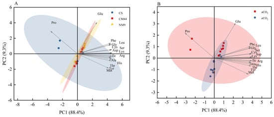 Principal component analysis (PCA) of the amino acid concentrations (A) in three wheat cultivars and (B) under different CO2 conditions. The contributions of each PCA axis (PC1 and PC2) are indicated on the graph. Abbreviations: CS, Chinese spring; CM44, Chuanmai 44; NM9, Neimai 9.