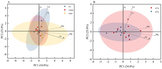Principal component analysis (PCA) of the mineral element concentrations (A) in three wheat cultivars and (B) under different CO2 conditions. The contributions of each PCA axis (PC1 and PC2) are indicated on the graph. Abbreviations: CS, Chinese spring; CM44, Chuanmai 44; NM9, Neimai 9.