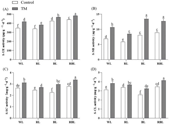 Effects of T. harzianum inoculation (TM) under different spectral conditions on soil enzyme activities in the rhizosphere soil of tomato plants. (A) soil urease (S−UE) activity, (B) soil nitrate reductase (S−NR) activity, (C) soil sucrase (S−SC) activity, and (D) soil cellulase (S−CL) activity. Each value represents the mean ± standard error, with error bars indicating the standard deviation from three independent replicates. Different letters denote significant differences assessed by the Fisher LSD test (p ≤ 0.05).