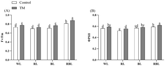 Effects of T. harzianum inoculation (TM) under different spectral conditions on chlorophyll fluorescence parameters of tomato seedlings. (A) the maximal photochemical efficiency of PSII (Fv/Fm), and (B) the photosystem II potential activity (ΦPSII). Each value represents the mean ± standard error from three independent replicates. Different letters denote significant differences assessed by the Fisher LSD test (p ≤ 0.05).