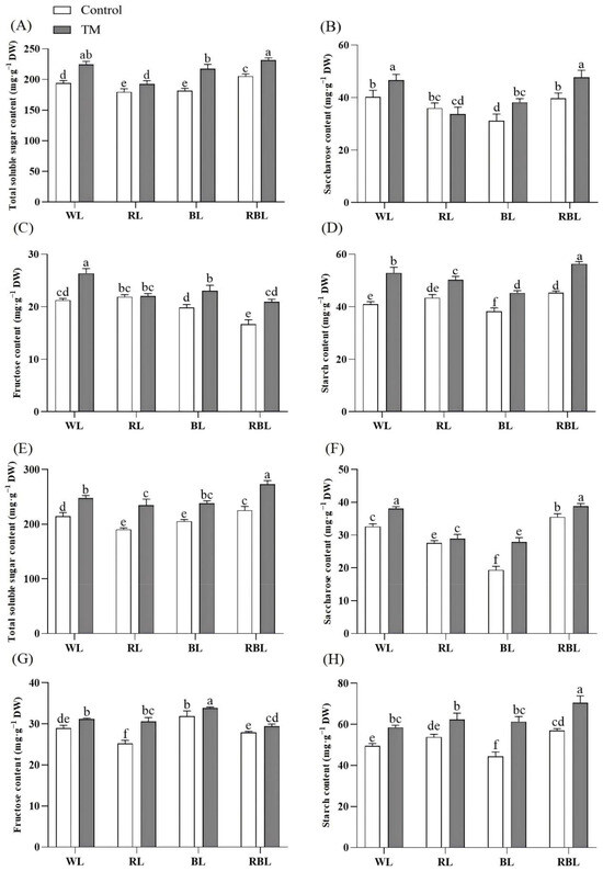 Effects of T. harzianum inoculation (TM) under different spectral conditions on photoassimilation products. (A) total soluble sugar content, (B) sucrose content, (C) fructose content, and (D) starch content in tomato leaves; (E) total soluble sugar content, (F) sucrose content, (G) fructose content, and (H) starch content in tomato roots. Each value represents the mean ± standard error from three independent replicates. Different letters denote significant differences assessed by the Fisher LSD test (p ≤ 0.05).