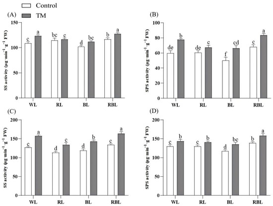 Effects of T. harzianum inoculation (TM) under different spectral conditions on carbon metabolism enzyme activity. (A) Leaf SS activity, (B) leaf SPS activity, (C) root SS activity, and (D) root SPS activity. Each value represents the mean ± standard error from three independent replicates. Different letters denote significant differences assessed by the Fisher LSD test (p ≤ 0.05).