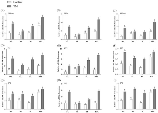 Gene expression in the leaves or roots of tomatoes inoculated with T. harzianum (TM) under different spectral conditions. (A) FBPase gene in leaves, (B) FBPA gene in leaves, (C) SBPase gene in leaves, (D) TPI gene in leaves, (E) HY5 gene in leaves, (F) SS2 gene in leaves, (G) SPS gene in leaves, (H) SS2 gene in roots, (I) SPS gene in roots. Each value represents the mean ± standard error from three independent replicates. Different letters denote significant differences assessed by the Fisher LSD test (p ≤ 0.05).