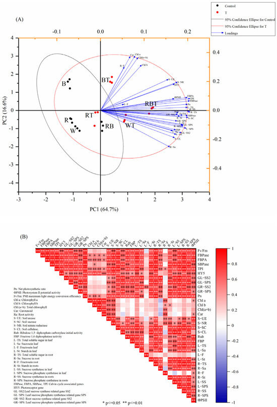 Principal component and Pearson correlation analyses were used to determine the relationships between a wide range of physiological and biochemical indicators, such as carbon metabolism, photosynthesis, and soil enzyme activity. PCA (Figure 8A) shows two principal components, PC1 and PC2, which explain a certain percentage of the total variance in the data: as shown in the figure, PC1 was 64.8% and PC2 was 16.5%. The longer the vector, the more significant the contribution of each variable to the index. Pn, photosynthetic enzyme activity, S−CL, S−SC, Fv/Fm, ΦPSII, Calvin cycle genes, and indicators related to carbon metabolism were highly consistent with PC1 and highly correlated with PC1. However, photosynthetic pigments (chlorophyll a, b, total chlorophyll, and carotenoids), soil nitrate reductase, and urease were more closely related to PC2. In addition, under different spectral conditions, there were differences within the WL, RL, BL, and RBL, which were groups inoculated and uninoculated with T. harzianum. However, the differences between the inoculated and uninoculated groups were not significant. This indicates that the effect of T. harzianum on tomato growth, photosynthesis, and carbon metabolism is affected by spectral conditions.