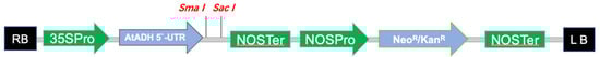 Partial map of pRI101-AN (TaKaRa). AtADH 5′-UTR: Arabidopsis thaliana Alcohol Dehydrogenase 5′ Untranslated Region. 35SPro and NOSPro: Cauliflower mosaic virus 35S promoter and nopaline synthase promoter. NOSTer: nopaline synthase terminator. RB: T-DNA right border. LB: T-DNA left border.