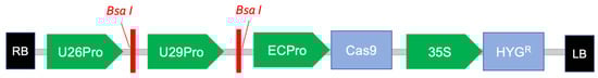 Partial map of the M2CRISPR vector (After Pujie Bio). U26Pro, U29Pro, ECPro and 35S: promoters. HYGR: hygromycin resistance gene. RB: T-DNA right border. LB: T-DNA left border.