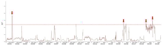 Manhattan plot for QTL mapping of protein content in peanut. Arrows indicate the prominent peaks exceeding the red significance threshold line.