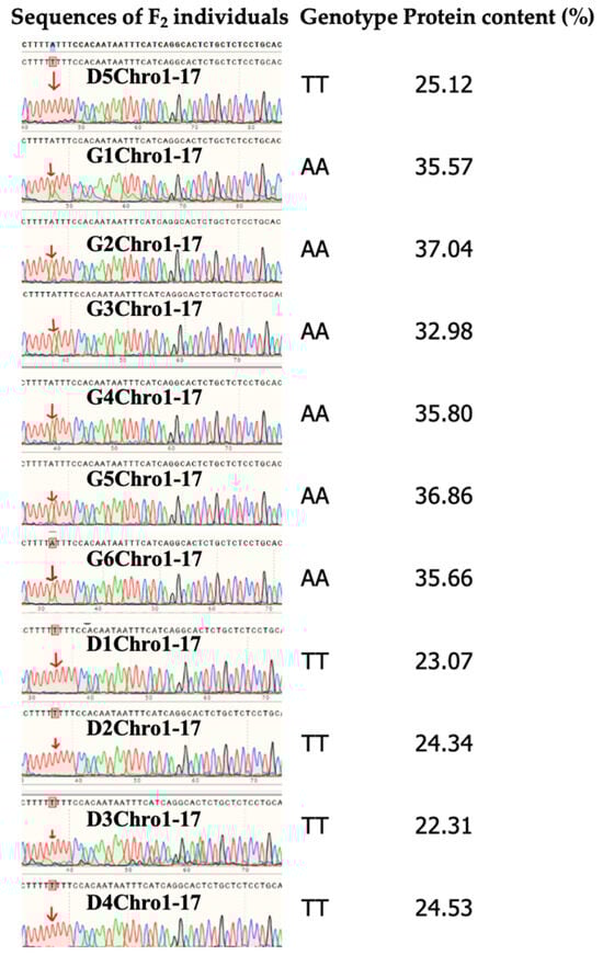 For single-marker analysis, an independent-sample t-test was conducted using protein content data and grouped genotypes. The primer pair Chro1-17 revealed a highly significant difference in seed protein content among F2 individuals with distinct genotypes (t = 14.6581, df = 9, p = 0.0000 < 0.01). A clear separation was observed between the two genotype groups: one group consistently exhibited high seed protein content (mean protein content was 35.65%), whereas the other showed low seed protein content (mean protein content was 23.87%). Notably, this marker accounted for 95.20% of the phenotypic variation. Figure 5 displays the partial sequence alignment of Chro1-17 amplification products from selected F2 individuals with contrasting protein content. At the position indicated by the arrow, high-protein individuals consistently exhibited an “A”, while low-protein individuals displayed a “T” (Figure 5).