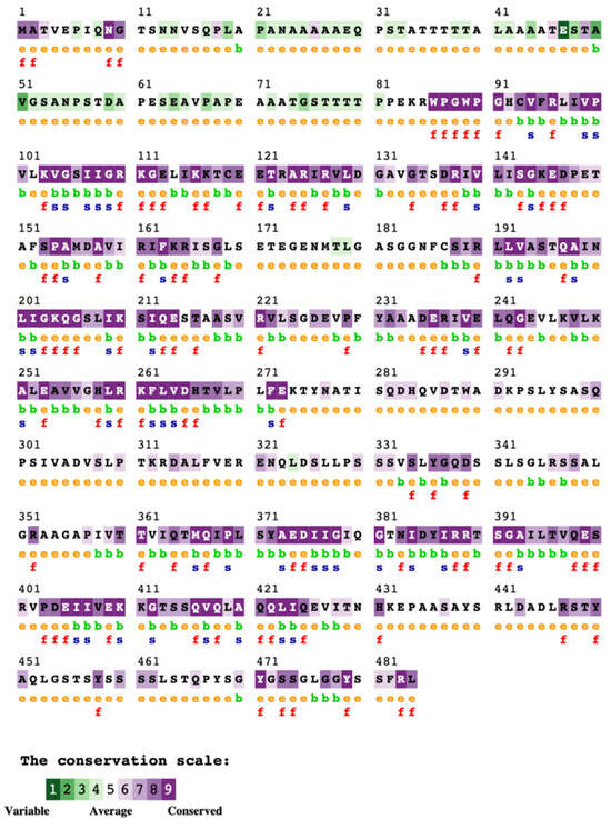 Evolutionary conservation analysis of amino acid residues predicted by ConSurf. e: Exposed residue, as predicted by the neural network-based algorithm. b: Buried residue, as predicted by the neural network-based algorithm. f: Functional residue (highly conserved and exposed). s: Structural residue (highly conserved and buried). x: Insufficient data (sequence coverage <10% at this position).