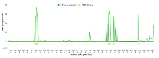 The RNA-binding residues predicted by hybridRNAbind are shown in Figure 7. For the amino acid K (lysine) at position 410, the prediction results were as follows: RNA_propensity was 0.004 (indicating very low binding affinity), and RNA_binary was 0 (predicted as a non-binding site). K410 itself was not predicted to be a key residue for RNA binding. Due to its inherently low binding propensity, the mutation at K410 was unlikely to significantly affect RNA-binding capability.