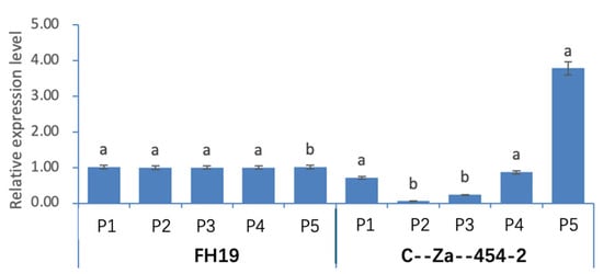 Relative expression of AhSPC gene in peanut seeds of different developing stages (P1–P5). FH19: low-protein wild-type peanut cultivar, C--Za--454-2: high-protein mutant of FH19. Within each of the wild-type and mutant groups, expression levels marked with distinct lowercase letters denote statistically significant differences at the 0.01 probability level. Error bars indicate standard deviation (SD).