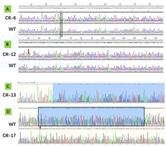 Verification of CRISPR edits through AtSPC sequence alignment in four Arabidopsis lines, CR-6 (A), CR-12 (B), CR-13 (C), and CR-17 (D). Sequences of non-transgenic control (WT) are listed for comparison. (A) The rectangular box indicates the start of a series of overlapping peaks extending downstream. (B) The arrow points to the site of a G insertion. (C) The shaded area marks the region containing overlapping peaks. (D) The shaded area represents the 162 bp segment deleted in CR-17, with the arrow indicating the deletion site.